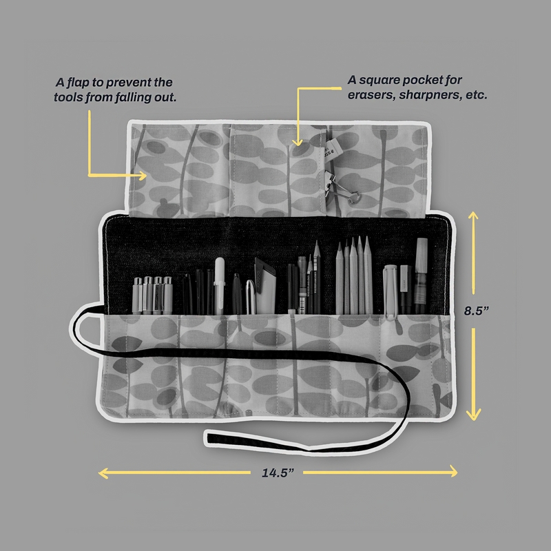 Introducing our take on the timeless classic - the artist's roll-up case. Crafted with the contemporary creative in mind, this beautiful and durable fabric kit allows you to store & carry your art supplies safely, and with ease.