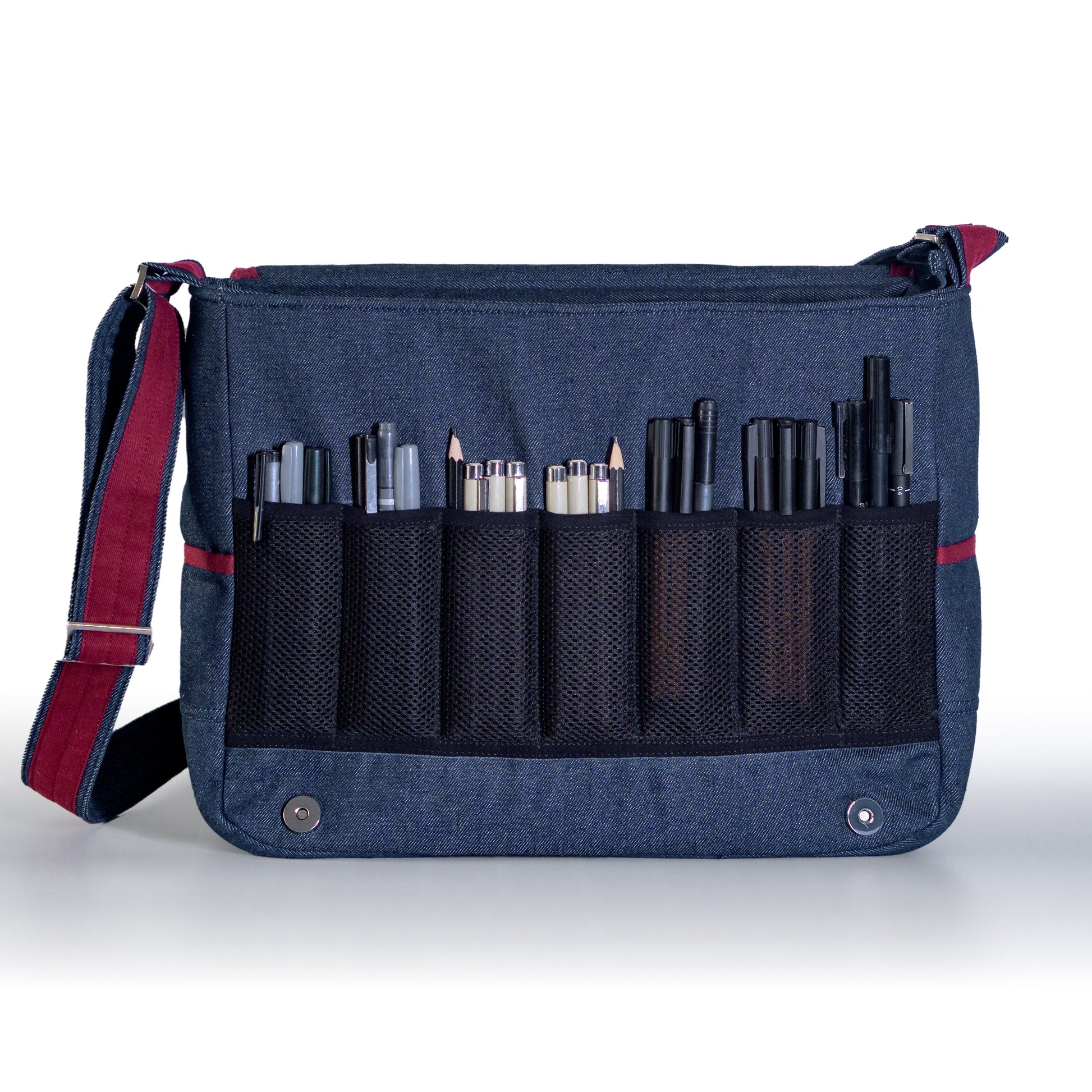 • Multiple sketchbooks in the main interior compartment.